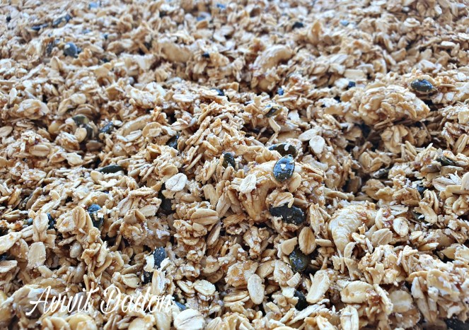 בקערה גדולה מאוד נשים את שיבולת השועל, והפיצוחים . נוסיף סוכר חום, סילאן וסירופ מייפל טבעי, נערבב היטב, תחילה עם כף, אחר כך נלוש היטב בשתי בידיים את כל התערובת.