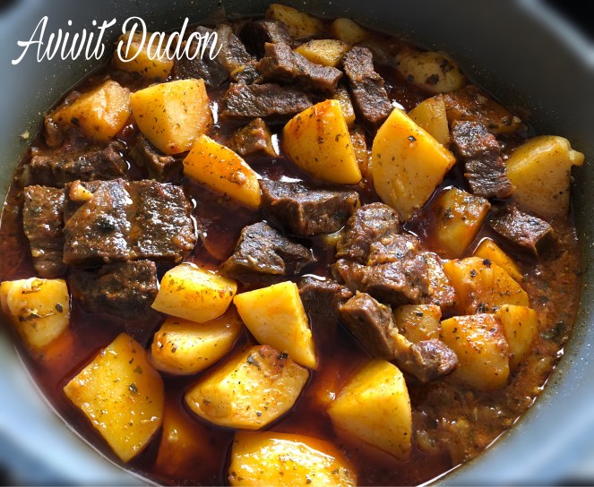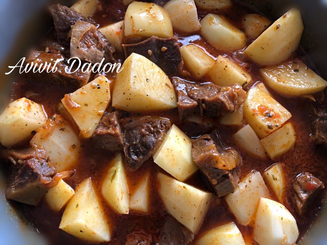 מבשלת על אש נמוכה, בהמון סבלנות עד שהנוזלים מצטמצמים ונשאר רוטב סמיך. מדי פעם לנער את הסיר ולהרטיב בעזרת כף את הבשר ותפוחי האדמה. רצוי לא לערבב מדי אלא רק לנער כדי שהתפוחי האדמה והבשר לא יתפרקו. לקראת סוף הבישול לבדוק עם מזלג אם הבשר ותפוחי האדמה רכים מספיק (לא מדי). אם עדיין לא התבשלו, להוסיף עוד חצי כוס מים ולבשל עם מכסה סגור.