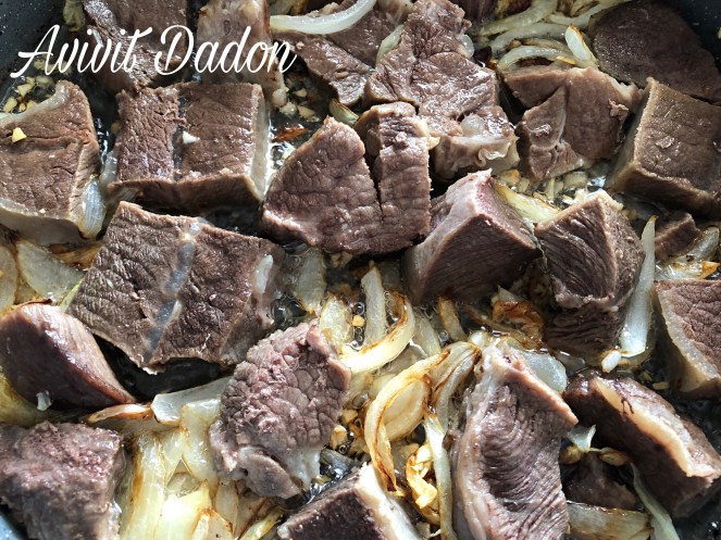 בסיר רחב עם רבע כוס שמןש קנולה אני מטגנת את הבצל עד לשקיפות, מוסיפה את השום ומטגנת עד להזהבה קלה. מוסיפה את הבשר ומטגנת אותו יחד עם הבצל והשום ו״סוגרת״ אותו מכל הכיוונים.