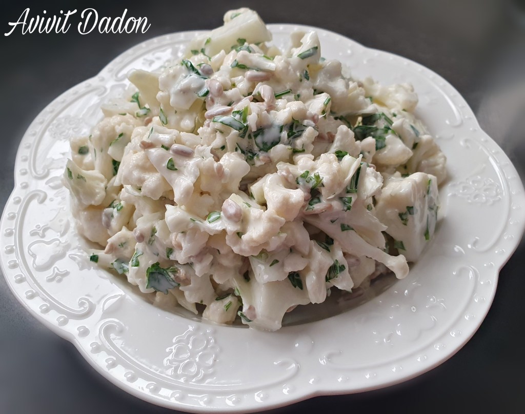 ראשית אני מפרידה את פרחי הכרובית ושוטפת במים חמים. מסננת. קוצצת את פרחי הכרובית גס. מוסיפה פטרוזיליה קצוצה, שום וגרעיני חמנייה. מתבלת במלח ומיץ לימון לפי טעם, מוסיפה את המיונז ומערבבת היטב.