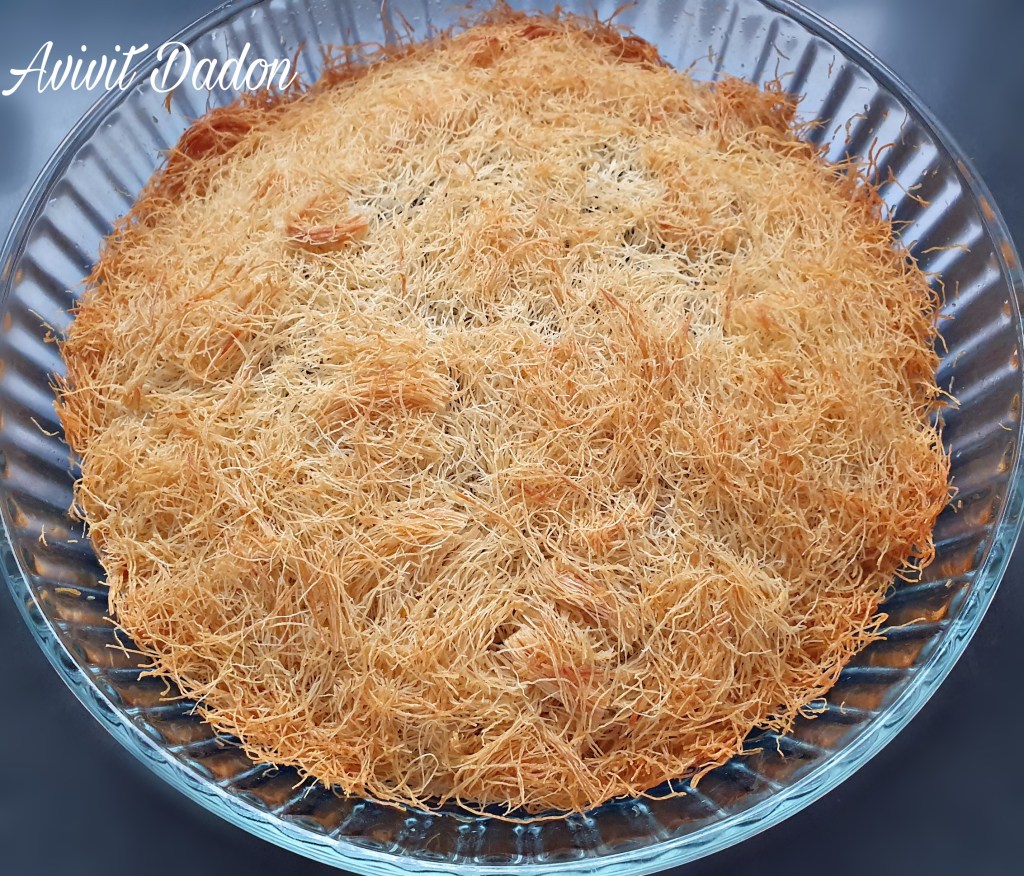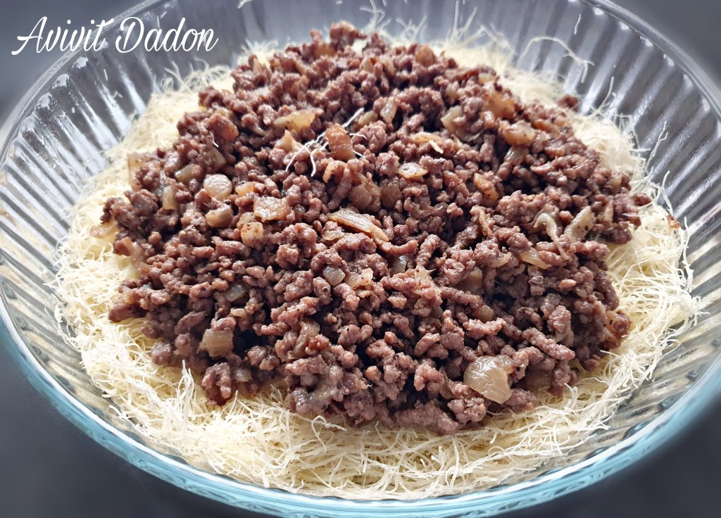 בינתיים נגזור ונפריד את אטריות הכנאפה בקערה. נשפוך מעליהם את המרגרינה שהמסנו ונלוש היטב בידיים, כך שכל אטריות הכנאפה יהיו ספוגות במרגרינה. נעביר מחצית מכמות האטריות לתבנית פיירקס. נשפוך מעל את המילוי.
