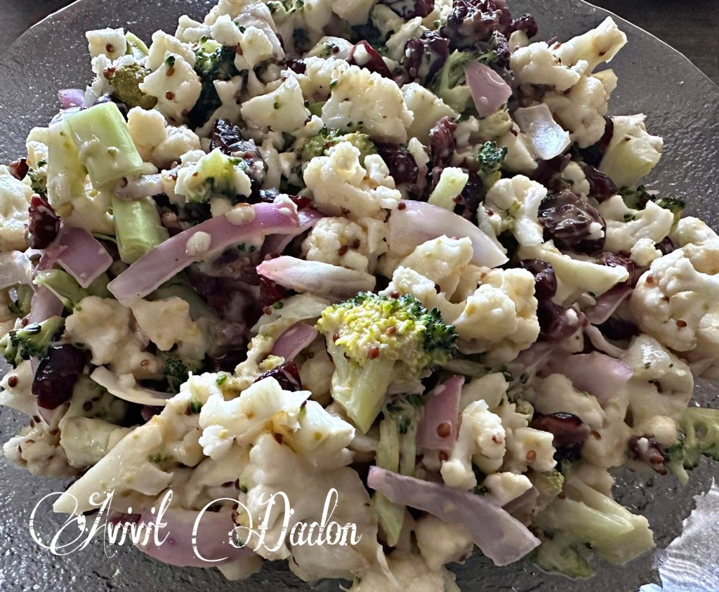אני קוצצת את הברוקולי והכרובית לפרחים קטנים, ומשרה אותם במים רותחים כרבע שעה. מסננת היטב ומעבירה לקערה.