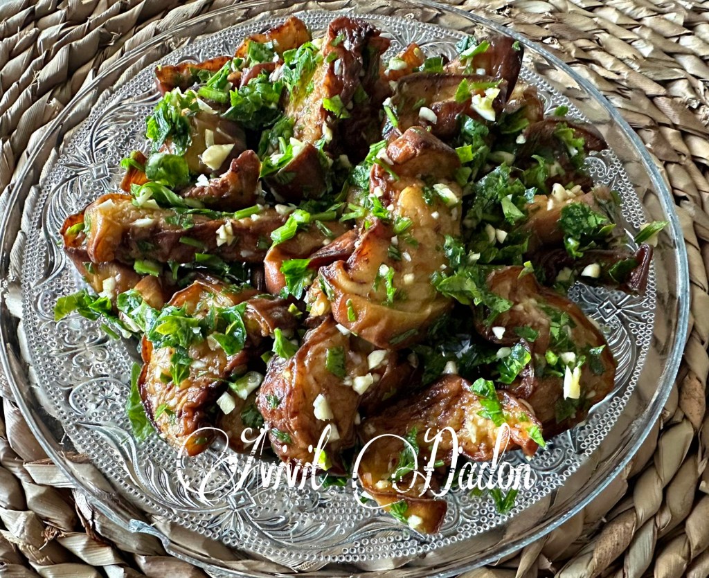 לאחר הטיגון נעביר לקערה. נוסיף את השום והפיטרוזיליה. נזלף מעל מעט חומץ ונערבב.