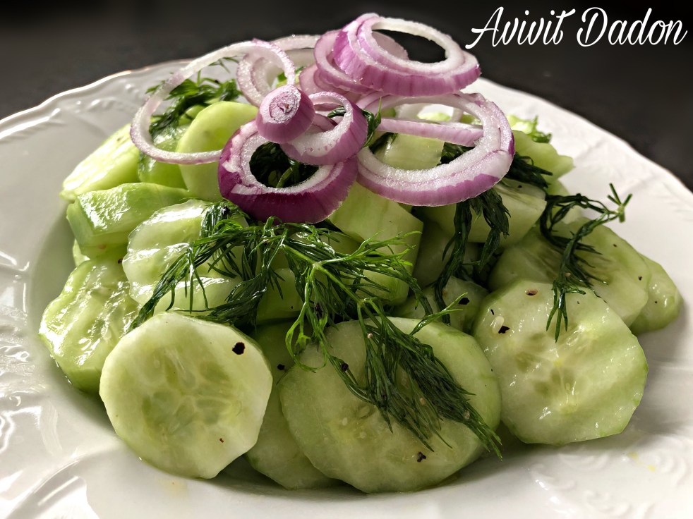 מצרכים: 6-8 מלפפונים קלופים ופרוסים חופן שמיר קצוץ בצל סגול קטן פרוס 2 כפות שמן זית מיץ מחצי לימון או חומץ לפי טעם מלח, פלפל שחור גרוס לפי טעם אופן ההכנה: מערבבים הכל יחד ונותנים מנוחה של כחצי שעה לספיגת טעמים.
