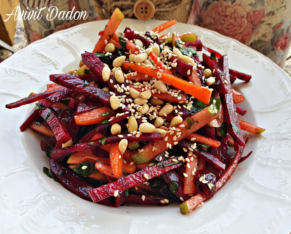 סלט ססגוני ומרהיב... שלפעמים הוא גם קינוח 😉 מרכיבים: סלק בינוני חתוך לרצועות כמו גפרורים גזר גדול חתוך לרצועות כמו גפרורים תפוח ירוק חתוך לרצועות כמו גפרורים 1/2 כוס חמוציות חופן נענע קצוצה חופן פיטרוזיליה קצוצה שתי כפות שומשום ושתי כפות צנוברים, לקלות כדקותיים על מחבת לערבב הכל יחד. לרוטב: 1/4 כוס שמן 1/4 כוס… להמשיך לקרוא סלט סלק עשיר